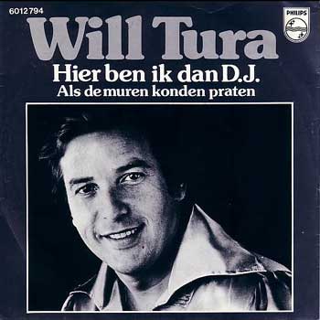 | Hit in België Will Tura werd in 1940 als Arthur Blanckaert in België geboren. Als jongeman tekende hij een platencontract bij de befaamde direkteur en muziekuitgever Jacques Klüger, later nam diens zoon Jean het vaandel over. Peter Koelewijn maakte voor het eerst kennis met Will in 1960 tijdens een TV-uitzending in het Amerikaans Theater in Brussel. Koelewijn bracht daarin met zijn Rockets zijn eerste hit “Kom van dat dak af”, Tura had er al een paar successen op zitten. “Wij waren na de show onze instrumenten in een gehuurd VW busje aan het laden”, herinnerde Peter zich later tegenover Will “toen ik jou zag wegscheuren in je Karmann Ghia. Zo´n wagen wil ik óók nog ´ns, dacht ik jaloers”. De twee kwamen elkaar later regelmatig tegen en spraken vaak af om samen eens iets te doen. Dat gebeurde pas in 1978, toen Koelewijn zijn eigen produktiemaatschappij Born Free was begonnen. Hij verbaasde zich al lang dat een zo´n gerenommeerde artiest als Tura zo weinig in Nederland scoorde. In het verleden had hij een paar keer succes gehad met o.a. “Ik ben zo eenzaam zonder jou” en “Hopeloos”, maar daar was het bij gebleven. Dus schreef Peter “Hier ben ik dan DJ”, waarin hij de Belgische zanger liet vertellen dat die wel weer naar het Nederlandse Hilversum zou komen om z´n muziek te promoten , maar dat hij tussen Breda en Hilversum zich afvroeg of het niet vergeefs zou zijn. Helaas kwam de plaat niet verder dan de tipparade. |